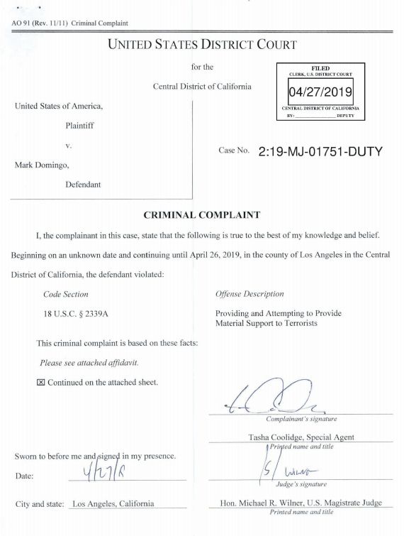美國檢察官尼克·漢娜說,多明戈想“尋求對穆斯林遭襲事件的報復”,計劃對猶太人,教堂和執法部門發動襲擊。漢娜還透露,多明戈是最近才皈依伊斯蘭教的。