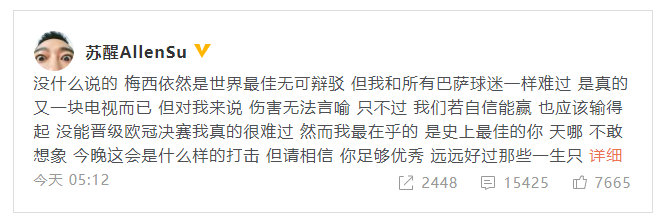 5月8日凌晨,作為巴薩死忠粉的蘇醒在微博曬出一段自己怒砸電視的視頻,并配文稱:“梅西依然是世界最佳無可辯駁”!