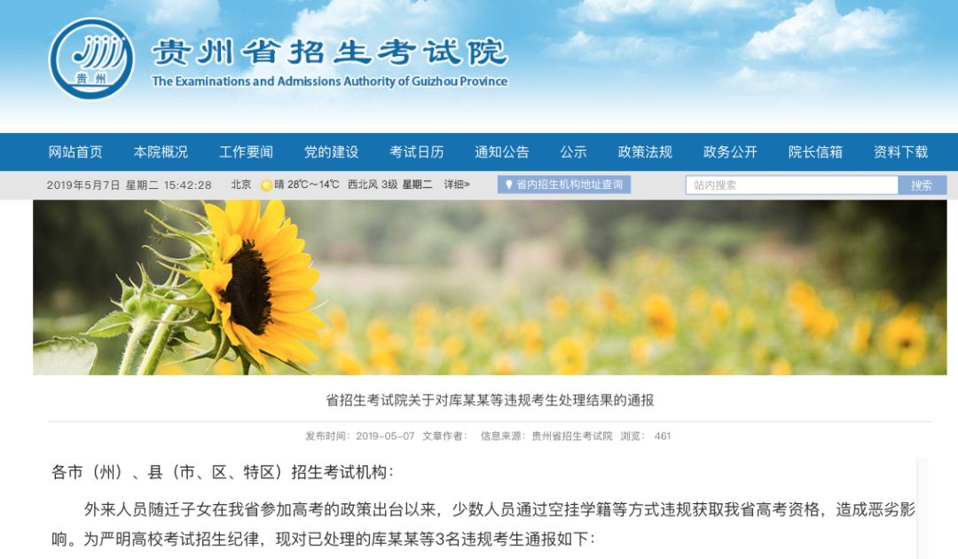 通報指出,外來人員隨遷子女在貴州省參加高考的政策出臺以來,少數人員通過空掛學籍等方式違規獲取貴州省高考資格,造成惡劣影響。為嚴明高校考試招生紀律,通報已處理的庫某某等3名違規考生情況。