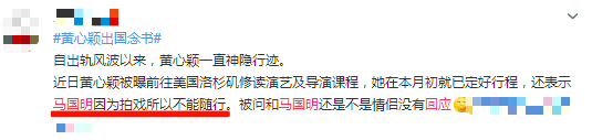 還有“知情媒體“表示黃心穎前往美國,本來是在本月初就定好了去美國的行程,馬國明因為行程問題無法隨行。
