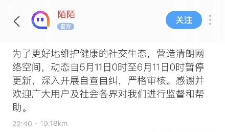 據(jù)外媒報道,陌陌公司今日公告,根據(jù)有關(guān)政府部門指導(dǎo)通知,在自2019年5月11日起的一個月中,公司將推出相關(guān)內(nèi)部措施,以加強內(nèi)容安全方面的工作。除其他相關(guān)自查措施外,此次自查工作中的重點,為公司將在2019年5月11日至2019年6月11日期間,暫時性的關(guān)閉用戶發(fā)布動態(tài)的功能。目前,對此項自查措施可能對公司運營產(chǎn)生的影響陌陌正在進(jìn)行評估。