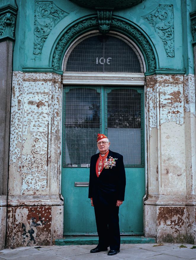 東倫敦,一位參加紀(jì)念活動的退役將軍站在一棟歷史建筑下留影,看似刻意,實際一切都是巧合。