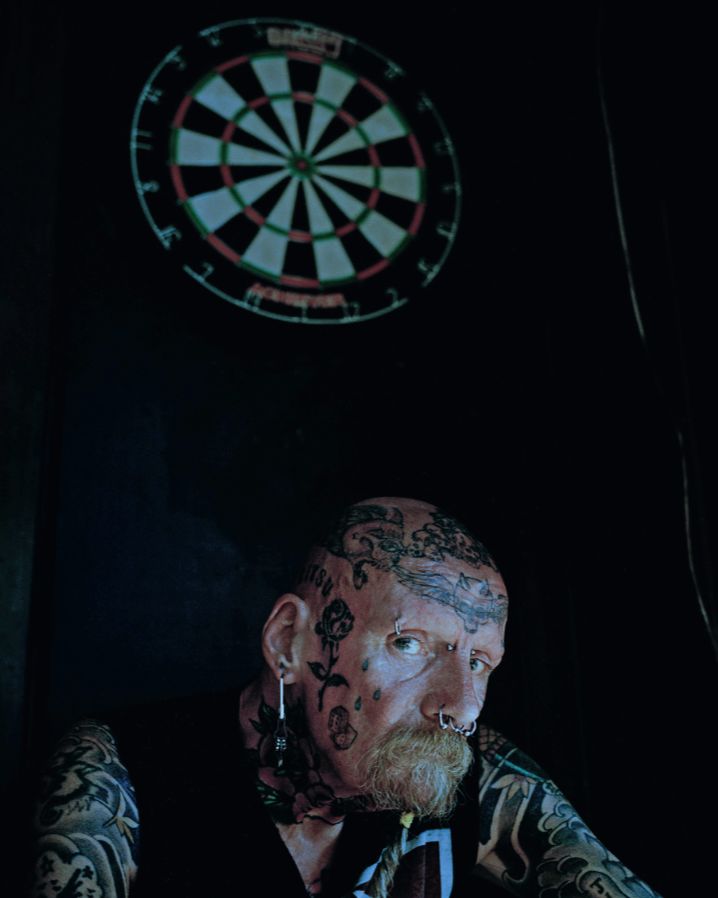 出現(xiàn)在鏡頭中的,也許是一面英格蘭旗,也許是酒吧里的一個標(biāo)靶,也許是一朵紋在臉上的玫瑰,也許就是走在街上的一位老者……一切圖景既有關(guān)又無關(guān)。“有些照片甚至是我在酒吧喝醉之后拍的。”山姆笑道。