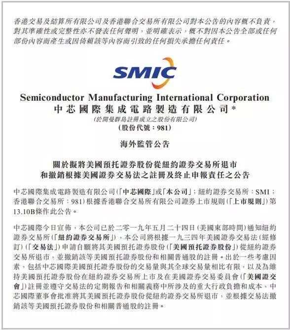 5 月24 日晚,香港、美國兩地上市的中芯國際在香港證券交易所發布公告稱,公司決定主動從紐約證券交易所退市,且已得到董事會批準。