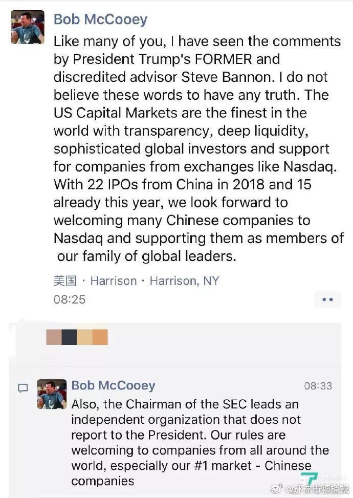 “像許多人一樣,我看到了特朗普總統名譽掃地的前顧問史蒂夫·班農發表的言論。我認為這些話沒有任何道理可言。美國資本市場是世界上最好的資本市場,具有透明度、深度流動性,擁有成熟的全球投資者以及納斯達克等交易所對公司的支持。在2018年,來自中國的IPO有22起,今年已經有15起IPO。我們期待看到大量中國公司來到納斯達克,我們視中國公司為我們全球領導人大家庭的一員,并且將給予他們支持。”麥庫伊說。