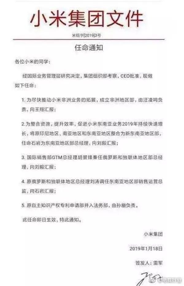 公開(kāi)資料顯示,汪凌鳴于2017年上半年加入小米,任小米公司副總裁。早期他曾擔(dān)任小米國(guó)內(nèi)的銷售與服務(wù)部總經(jīng)理,2019年被調(diào)往國(guó)際部。2019年1月20日,小米集團(tuán)發(fā)布任命文件,文件稱經(jīng)國(guó)際業(yè)務(wù)管理層研究決定,集團(tuán)組織部考察,CEO批準(zhǔn),為盡快推動(dòng)小米非洲業(yè)務(wù)的擴(kuò)展,成立非洲地區(qū)部,由汪凌鳴負(fù)責(zé),向王翔匯報(bào)。