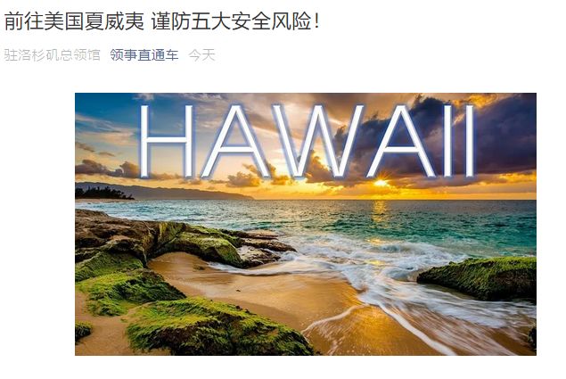 今天,外交部領事司微信公號“領事直通車”轉發了中國駐洛杉磯總領事館對前往夏威夷的中國人發出的五大安全風險提醒?!?/p>