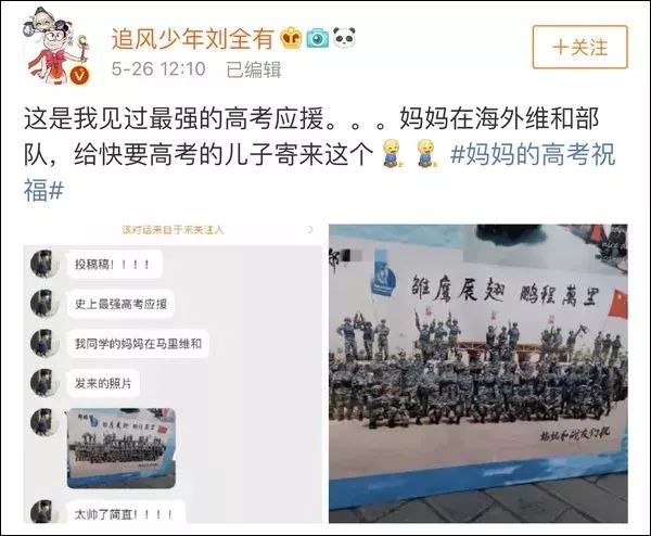2019年高考開考在即,有關高考的各類話題也漸漸火熱了起來。26日,@追風少年劉全有收到投稿,稱一高三學生鄭某,收到了正在海外執行維和任務的媽媽發來的硬核照片。
