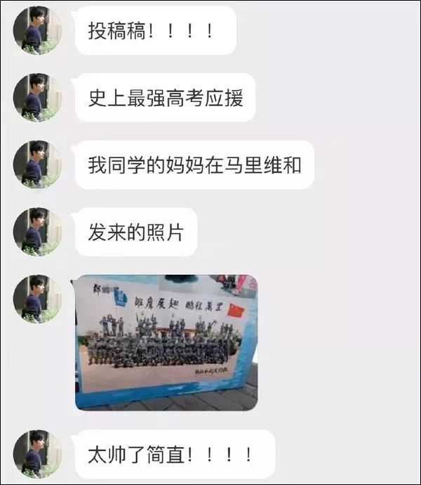 鄭某同學的母親是正在馬里執行任務的中國維和警察的一員,無法親自陪伴兒子度過高考沖刺階段的她,從遠方發來了這張照片來鼓舞兒子。合影中的中國維和警察們擺出各種帥氣姿勢為鄭同學加油打氣,“史上最強高考應援團”獲得網友們陣陣驚呼贊嘆。