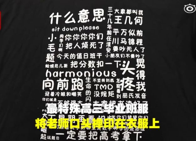 2、高三畢業班服印老師口頭禪 滿滿的愛和回憶 26日,江蘇淮安一高三畢業班的學生把老師的口頭禪印在班服上。班主任的名字,數學老師的金句和英語老師的淮式發音等,都承載了學生三年的回憶和老師的祝福。一看就能回想起上課時的場景!(@時間視頻)