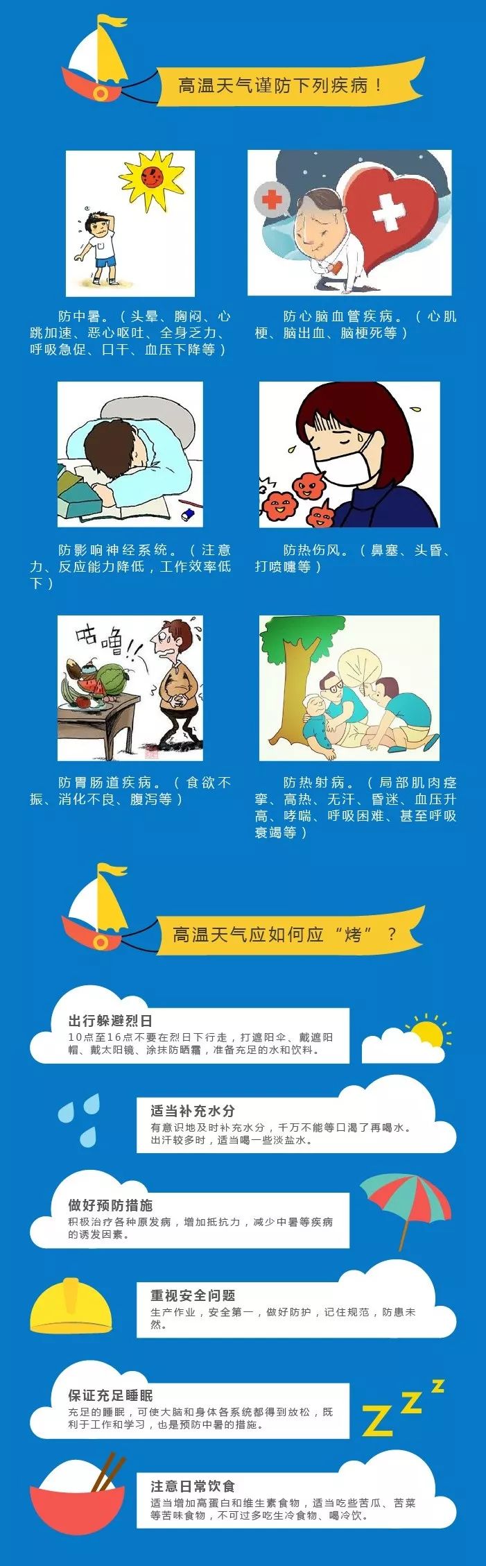 氣象部門提示,盡量避免午后高溫時(shí)段的戶外活動(dòng),對老、弱、病、幼人群提供防暑降溫指導(dǎo),并采取必要的防護(hù)措施;有關(guān)部門應(yīng)注意防范因用電量過高,電線、變壓器等電力設(shè)備負(fù)載大而引發(fā)火災(zāi);戶外或者高溫條件下的作業(yè)人員應(yīng)當(dāng)采取必要的防護(hù)措施;注意作息時(shí)間,保證睡眠,必要時(shí)準(zhǔn)備一些常用的防暑降溫藥品。