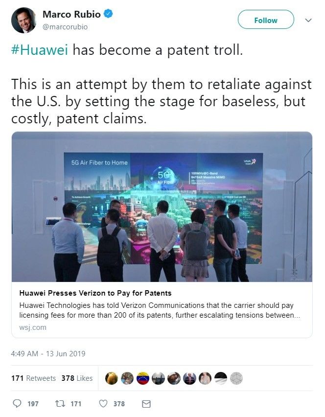 可昨天,當這位天天都在叫嚷中國“偷”美國“知識產權“的盧比奧,突然發現中國的華為公司開始要求美國企業給華為支付數億美元的專利費時,他立刻撤下了他在中國面前那套“知識產權捍衛者”的偽裝,轉而辱罵華為公司是“專利流氓”起來,還宣稱華為的專利都是“沒有依據”的…..