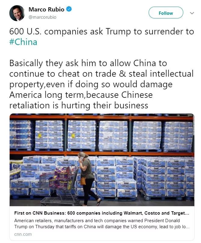 這不,除了想在華為面前賴賬,害美國成為盜竊中國知識產權的小偷,這個盧比奧還在他最新發布的一個貼文里辱罵600多家希望特朗普停止對中國揮舞關稅大棒和貿易沖突的企業是“投降分子”,還造謠說這些企業是因為中國的回擊而損害了它們的利益,就想讓特朗普投降。