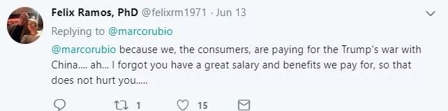 不過話說回來,不論是在辱罵華為、還是在辱罵美國企業的帖子下,也有不少美國網民根本不支持盧比奧這種“愛國賊”的言行。因為這些網民清楚,倒霉的并不是盧比奧等拿著豐厚薪水和福利的美國政客,而恰恰是他們這些普通的美國消費者啊……