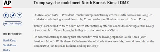 據(jù)此前報道,29日一早,正在日本參加G20大阪峰會的美國總統(tǒng)特朗普在推特上發(fā)文,宣布將與韓國總統(tǒng)文在寅一同前往韓國。特朗普還說,他想“在(朝韓)邊界/非軍事區(qū)見金正恩一面,只為握個手說聲你好”。CNN等多家外媒將特朗普的話解讀為對金正恩的邀請。