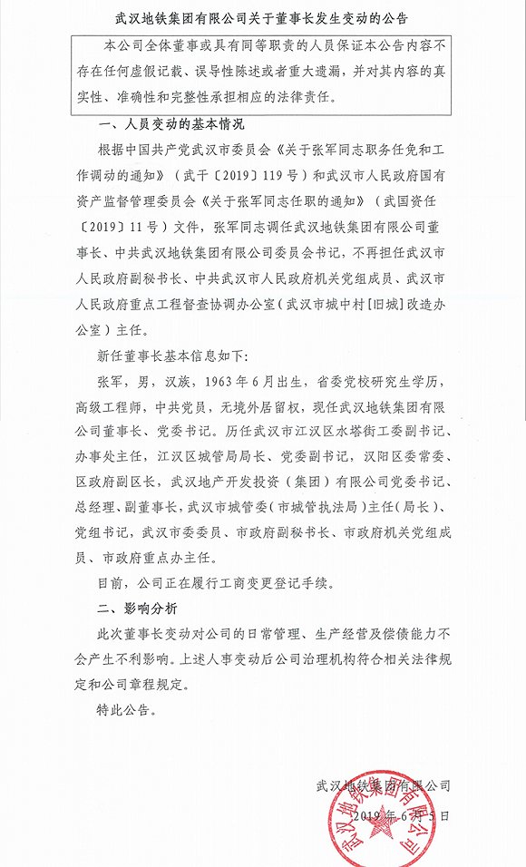 界面新聞從中國債券信息網獲悉,武漢地鐵集團有限公司6月5日發布關于董事長變更的公告,張軍調任武漢地鐵集團有限公司董事長、中共武漢地鐵集團有限公司委員會書記,不再擔任武漢市人民政府副秘書長、中共武漢市人民政府機關黨組成員、武漢市人民政府重點工程督查協調辦公室(武漢市城中村[舊城]改造辦公室)主任。
