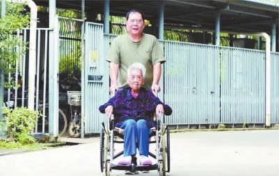 陳文森推著母親李聲英老人外出(資料圖片)百步亭社區(qū)供圖