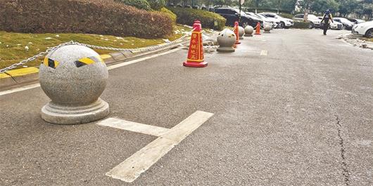昨日上午,楚天都市報記者來到該小區,看到路邊劃白線設置了一些車位。部分車位已經被石墩子等設施擋住(如圖)。
