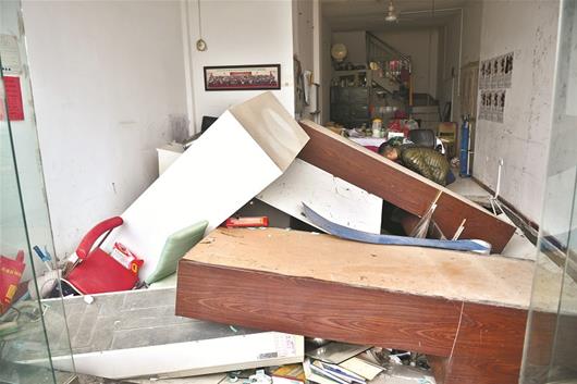李先生的店在小區5棟,租用了臨街的兩層樓作為推拿按摩店的門面,樓下經營,樓上住家。昨日上午10時許,楚天都市報記者來到現場看到,推拿按摩店一樓約40平方米,塌陷的面積約有20平方米,店里的家具、空調都倒了,店內一片狼藉。