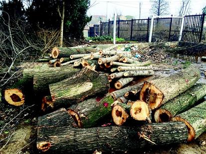 6日上午,楚天都市報記者來到小區,物業工作人員正用油鋸砍伐一棟房屋前的樹木。小區綠化帶中還有很多樹樁,記者注意到,小區樹木并非成片被砍,被砍的樹都間雜在綠化帶中。在小區建筑垃圾堆放點,記者看到被砍伐的大樹被鋸成數截,樹干直徑有數十厘米。一輛貨車正在裝運樹干,裝運工人稱將運到造紙廠。