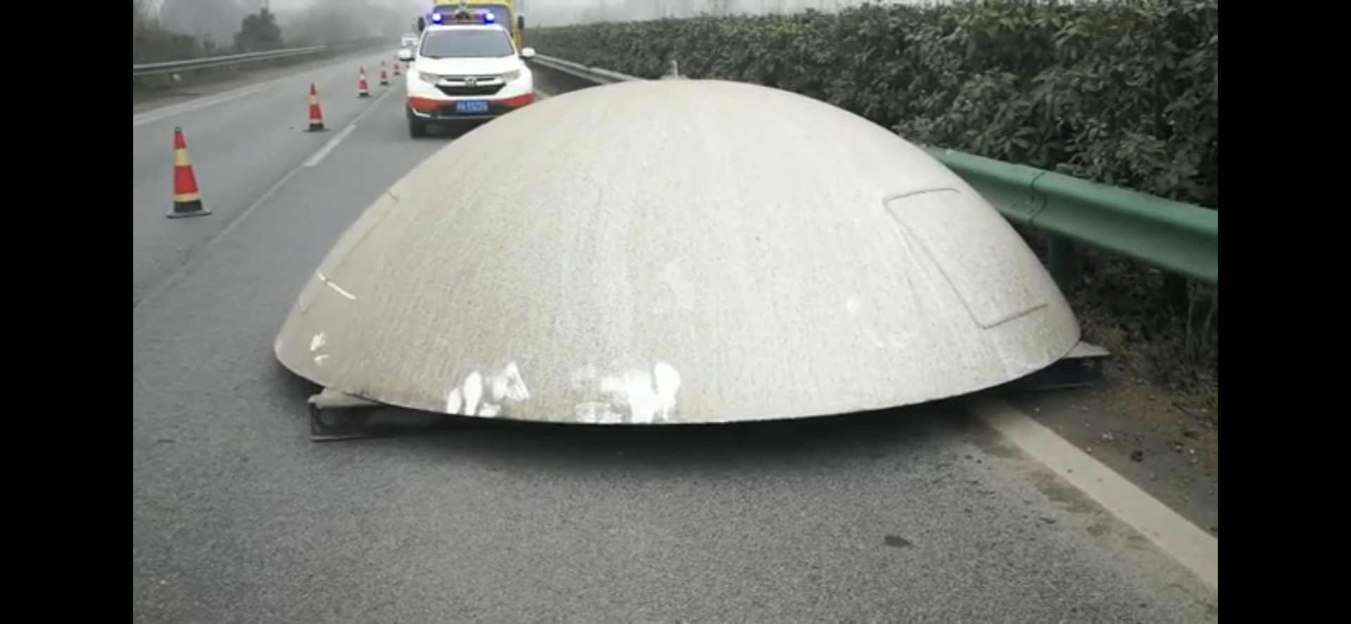 民警見此情況,立即在“大鍋”后方設置警戒區,圍著這個白色“大鍋”轉一圈,完全看不出來是個什么東西,而且它非常重,幾個人合力推卻紋絲不動,有人開玩笑說:難不成是飛碟?