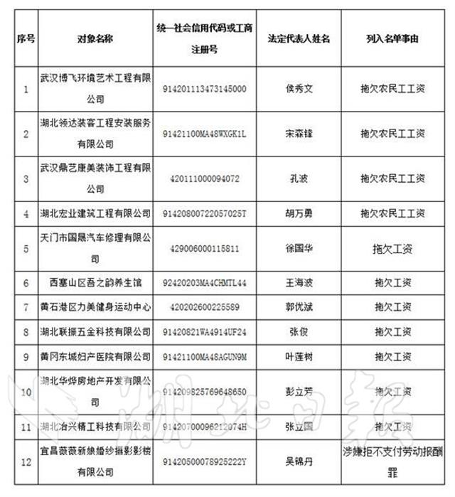 湖北日報訊(記者龍華、通訊員陳維、陳多紅)1月10日,省人社廳發布消息,2018年全省共有12家企業因拖欠工資被列入失信“黑名單”。