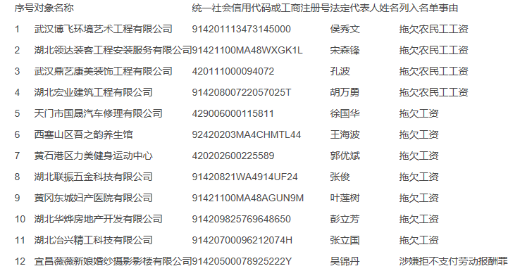 2018年,全省共有12家企業(yè)列入拖欠工資“黑名單”,名單如下: