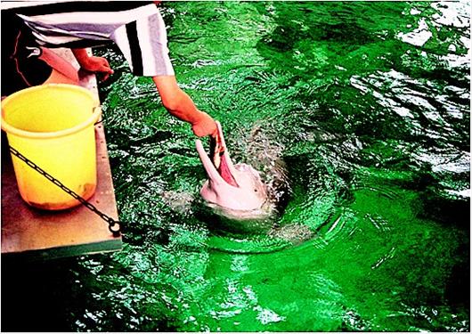 “淇淇”與“珍珍”的水池之間有個過道,水是相通的。白鰭豚之間通過聲音交流。“淇淇”到水生所已經很多年了,與野生白鰭豚的通訊交流有些困難。最初,它們相互害怕。一個風雨交加的晚上,“珍珍”有點害怕,忽然游進了“淇淇”的池子。“淇淇”泰然地接受了,一開始是“珍珍”追“淇淇”,后來“淇淇”更主動。