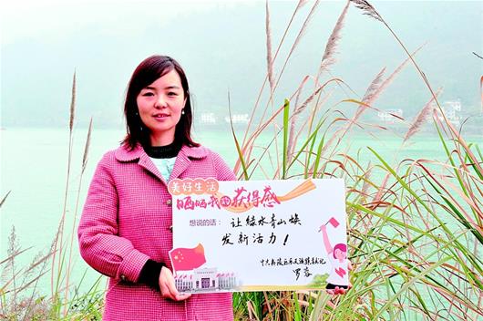 圖為:羅蓉寫下自己的感言:“讓綠水青山煥發(fā)新活力”。(視界網(wǎng) 張國(guó)榮 攝)