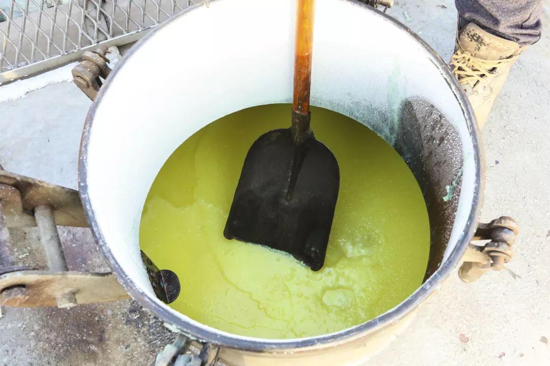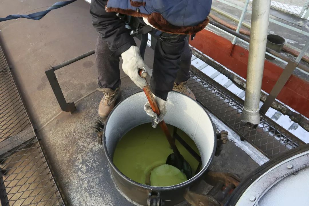 這個看似“奶油菠蘿”味的冰淇淋,其實是0號柴油,它的凝固點非常高,當溫度達到零下6度左右,這家伙就開始凝固成臘狀了。冬季的黑龍江室外氣溫平均近零下20度,經過幾天的鐵路運輸、轉儲,到達它的目的地,也就從一車液態燃料凍成一車“冰淇淋”了。