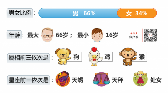 根據武漢馬拉松中簽數據,中簽選手中,男性占比66%,女性占比34%;年齡最大的中簽者為66歲,最小的中簽者為16歲;屬相排名前三的依次是狗、雞、猴;星座排名前三的依次是天蝎座、天秤座、處女座。