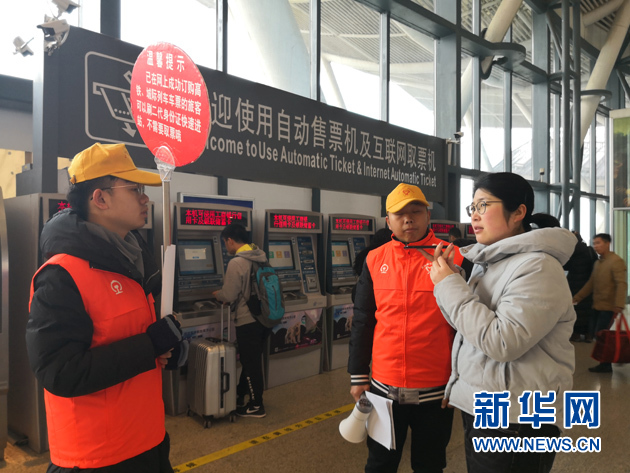 圖為:春運首日,在武漢火車站,志愿者為與家人走散的旅客王女士提供幫助。新華網余凌云攝