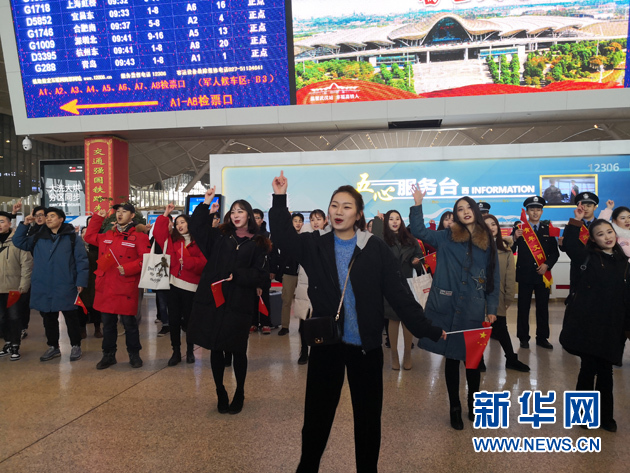 圖為:春運首日,武漢火車站舉行以“歌唱祖國”為主題的快閃活動。新華網余凌云攝