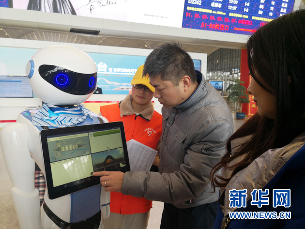 圖為:春運首日,武漢火車站四臺智能機器人上崗為旅客提供服務。新華網余凌云攝