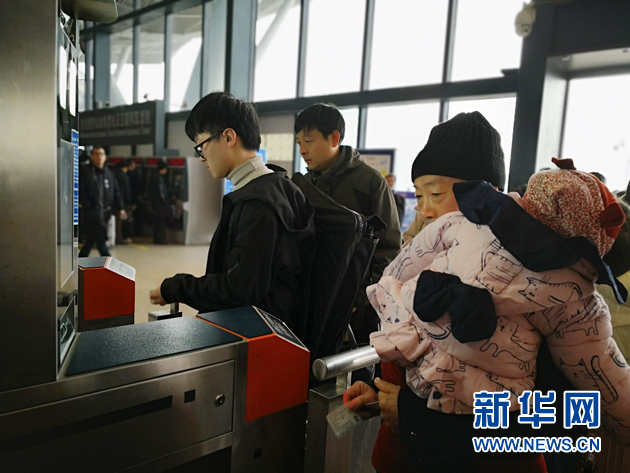 圖為:一位老年乘客懷抱熟睡的孫子,在武漢火車站通過智能刷臉閘機輕松進站。新華網余凌云攝