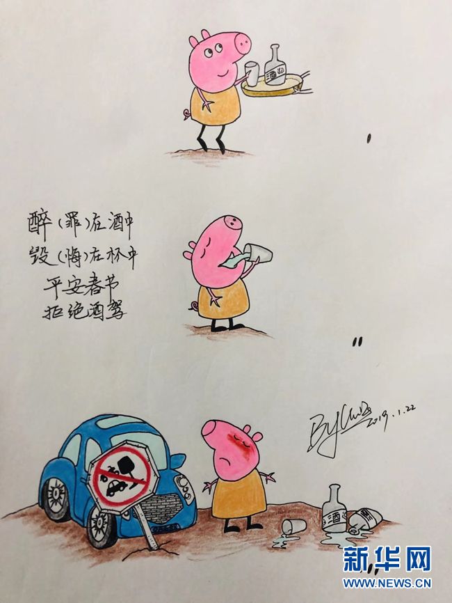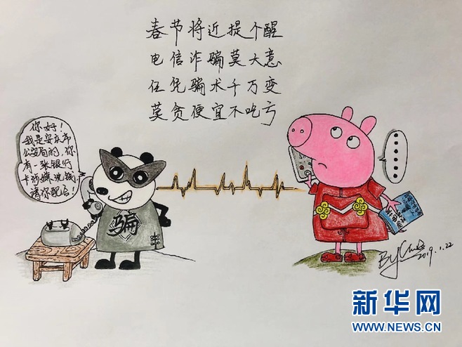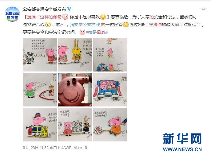新華網合肥1月25日電(李東標)“春節將近提個醒,電信詐騙莫大意。任憑騙術千萬變,莫貪便宜不吃虧?!彪S著豬年春節臨近,各種安全隱患也隨之增多。為此,安徽省安慶市一位民警手繪了一組小豬“佩奇”系列漫畫,提醒人們樹立安全意識。漫畫中,萌萌噠的“佩奇”俘獲了不少人的心,引發網友紛紛“點贊”。