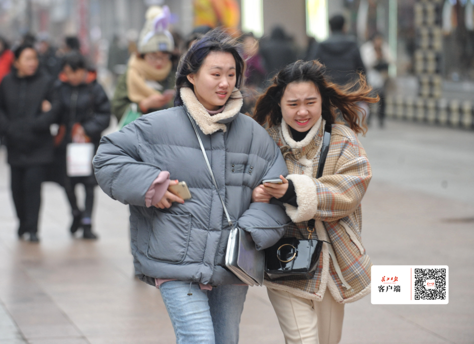 武漢大風降溫,街頭市民包裹嚴實抵御風寒。 記者 苗劍 攝