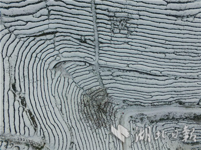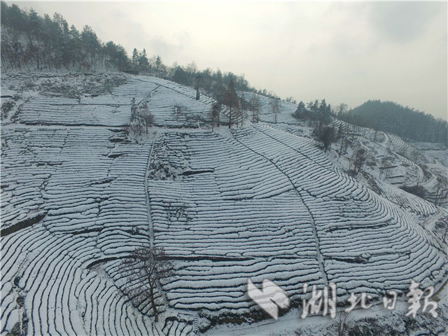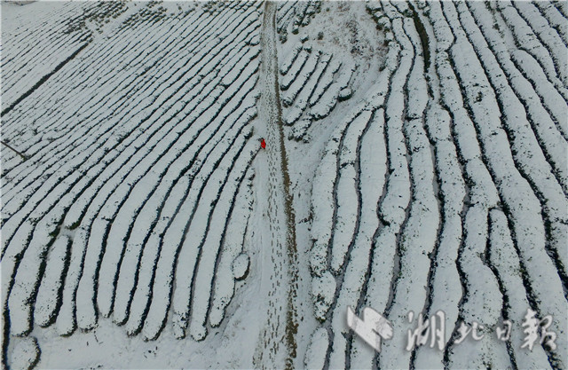 1月31日,湖北省??悼h官山茶園被白雪覆蓋(無人機航拍)。
