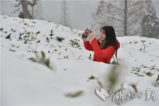 1月31日,一名游客在湖北省??悼h官山茶園欣賞雪景。