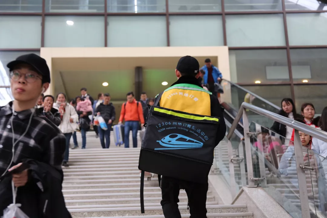 10時16分,剛送完第一單外賣的葉生又馬不停蹄地往回趕,此時還有旅客陸陸續續前往站臺乘車,不時有旅客好奇地張望逆向而行的葉生。