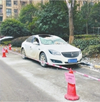 長江日報記者1月31日中午在該小區(qū)17棟樓下找到了被砸中的轎車。轎車周邊區(qū)域已被物業(yè)公司工作人員用警戒線圍起,并張貼了提示牌。