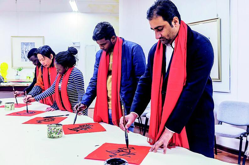 圖為:1月29日,4名中國一冶海外項目的外籍員工,受邀來漢歡度中國春節。圖為他們學寫“福”字。(湖北日報全媒記者梅濤 通訊員陳明齊鄭 攝)