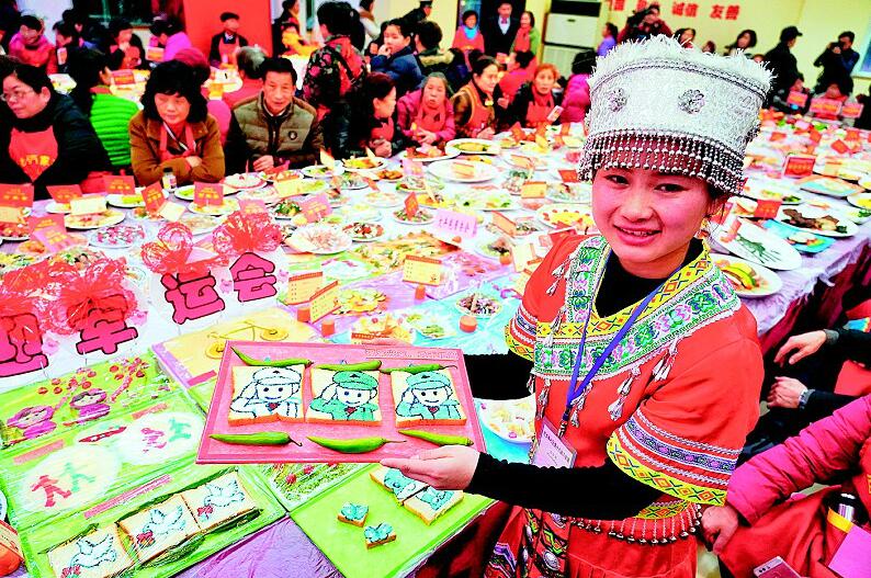 圖為:1月29日,武漢市百步亭社區“唱響新時代夢圓中國夢”萬家宴熱鬧開席,軍運會主題菜肴創意十足。(湖北日報全媒記者倪娜 攝)