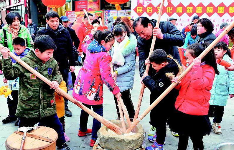 圖為:做魚丸、磨豆腐、扯油面、打糍粑……1月27日,黃岡市黃州區舉行民俗活動。圖為社區居民教小朋友們打糍粑。(視界網陳凌志 攝)