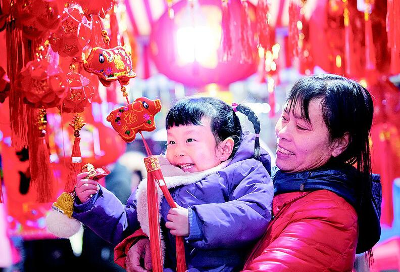 圖為:1月29日,孝感市湯家街小商品市場,挑選吉祥飾品的市民絡繹不絕。一位小朋友被萌萌的金豬吸引。(視界網晏美華 攝)