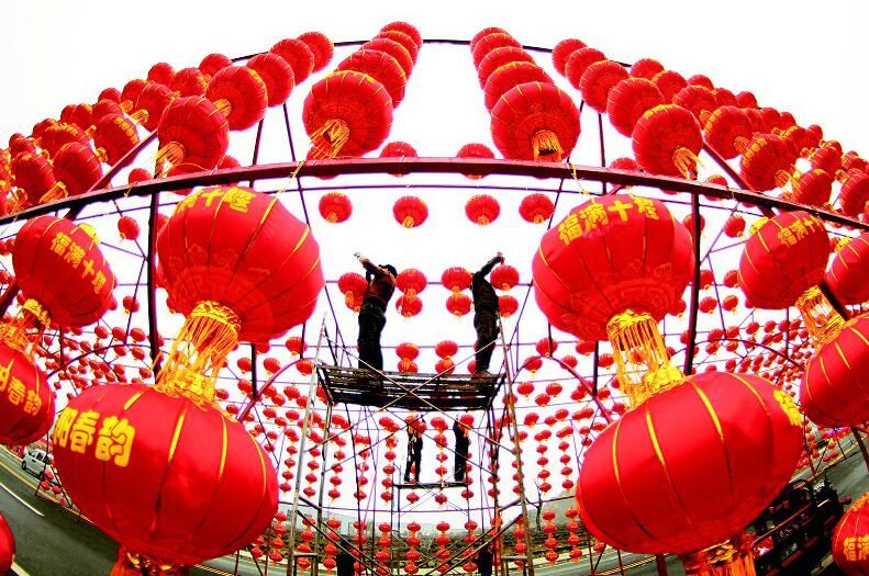 圖為:1月31日,十堰市鄖陽區茶店鎮櫻桃溝村,工作人員在懸掛大紅燈籠。春節期間,該村將舉辦首屆民俗花燈文化藝術節。(視界網曹忠宏攝)