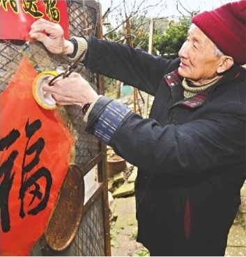 2月4日,農(nóng)歷大年三十,馬旭的丈夫顏學(xué)庸在居住的小院子里貼福字。
