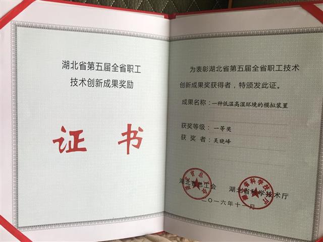 最讓他自豪的是,他研制的“低溫高濕環境的模擬裝置”,填補了國內外在該領域的空白,獲得國家專利和湖北省職工技術創新成果獎一等獎,已經在國家航天工程中廣泛應用。