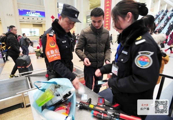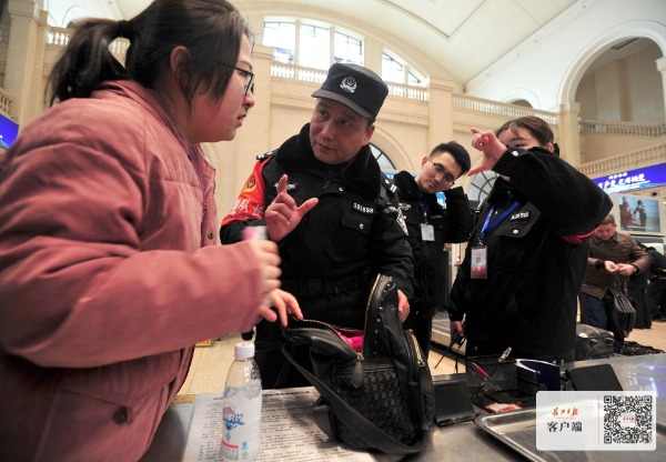 他主要負責漢口火車站入口處的安檢工作,時不時就會提醒車站安檢員加強對旅客行李的檢查,“主要是檢查有沒有攜帶危險品,尤其是在春運期間,要保證好車站的秩序”。同時,他還要在進站口、候車室、檢票口、站臺、出站口進行巡邏。