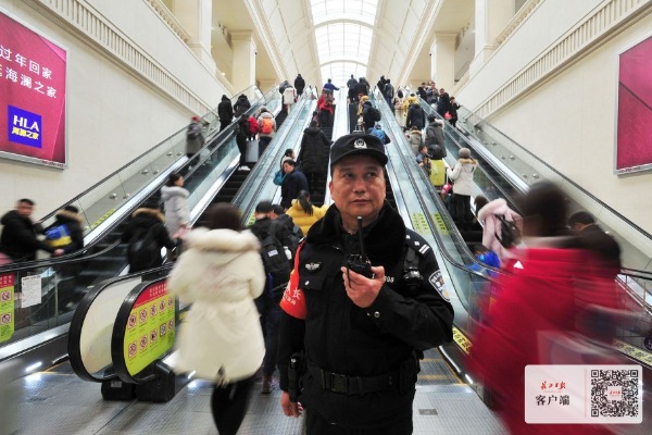 2月7日,59歲的李慶斌在漢口火車站值勤。記者史偉 攝